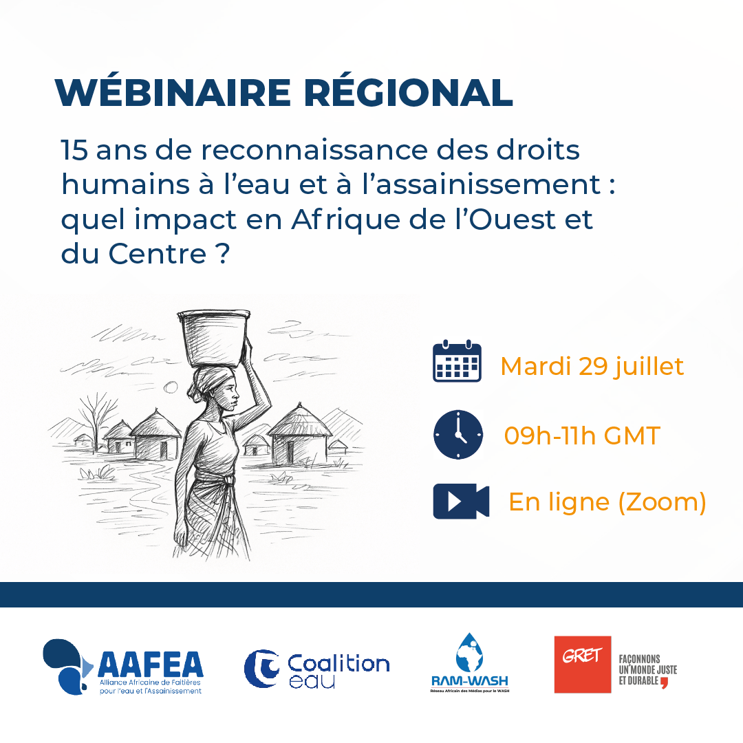 À l’occasion du 15e anniversaire de la reconnaissance officielle des droits humains à l’eau et à l’assainissement par l’ONU, un webinaire régional s’est tenu le mardi 29 juillet 2025, réunissant plusieurs participant.e.s issu.e.s notamment d’Afrique de l’Ouest et du Centre.